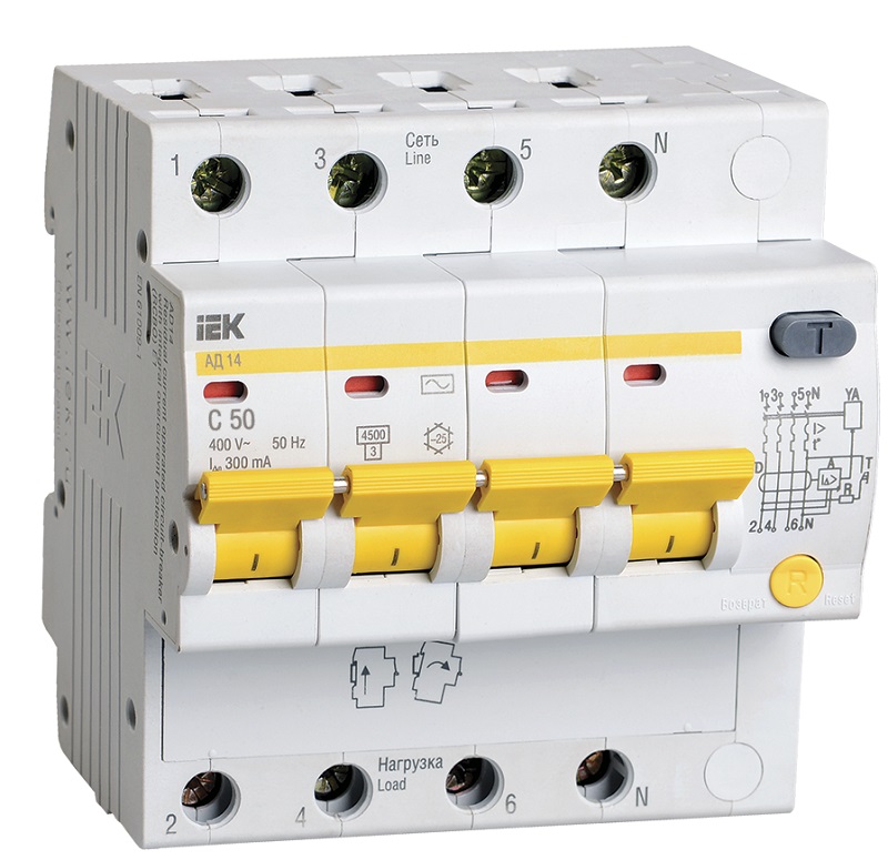 Автомат дифференциального тока АВДТ IEK KARAT АД14 4п 50А 300мА 4,5кА C тип AC