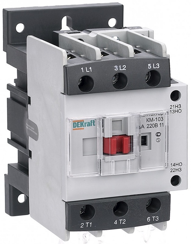 Контактор серии КМ-103 фирмы DEKraft устанавливается на стандартную DIN-рейку или прикручивается напрямую с монтажной пластине через монтажные отверстия на корпусе контактора. Контакторы КМ-103 предназначены для пуска и остановки асинхронных двигателей, для коммутации осветительных сетей и конденсаторных батарей в сетях напряжением до 690В переменного тока. Дополнительные защитные крышки исключают попадание пыли внутрь контактора и обеспечивают защиту от случайного прикосновения.