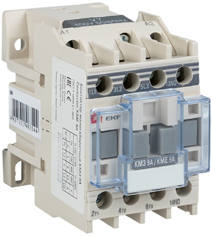 Контакторы КМЭ EKF PROxima состоят из корпуса, закрепленных в нем неподвижных контактов, подвижных контактов, которые закреплены в подвижной части магнитной системы. Неподвижная часть магнитной системы закреплена жестко в корпусе КМЭ. Пружина препятствует смыканию контактов. При подаче напряжения на катушку управления в магнитной системе контактора возникает магнитное поле, которое, преодолевая сопротивление пружины, смыкает магнитную систему и замыкает контакты. При отключении напряжения с катушки управления пружина размыкает контакты. Возможна коммутация алюминиевыми и медным проводом. Контактор крепиться на стандартную DIN-рейку или монтируется непосредственно на монтажную пластину электрического щитка.