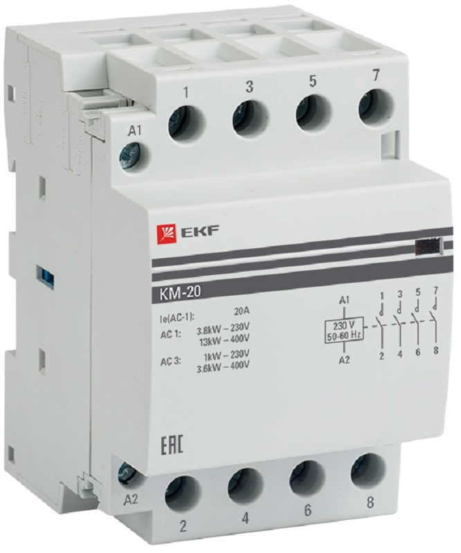 Модульные контакторы EKF PROxima представляют из себя контактор в классическом корпусе модульного оборудования. Он состоит из неподвижных контактов, подвижных контактов, которые закреплены в подвижной части магнитной системы. Неподвижная часть магнитной системы закреплена жестко в корпусе модульного контактора. Пружина препятствует смыканию контактов. При подаче напряжения на катушку управления в магнитной системе контактора возникает магнитное поле, которое, преодолевая сопротивление пружины, смыкает магнитную систему и замыкает контакты. При отключении напряжения с катушки управления - пружина размыкает контакты. Возможна коммутация алюминиевым или медным проводом. Монтируется на стандартную металлическую DIN-рейку.