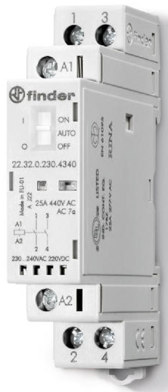 Модульный контактор Finder представляют из себя контактор в классическом корпусе модульного оборудования. Он состоит из неподвижных контактов, подвижных контактов, которые закреплены в подвижной части магнитной системы. Неподвижная часть магнитной системы закреплена жестко в корпусе магнитного контактора. Пружина препятствует смыканию контактов. При подаче напряжения на катушку управления в магнитной системе контактора возникает магнитное поле, которое, преодолевая сопротивление пружины, смыкает магнитную систему и замыкает контакты. При отключении напряжения с катушки управления пружина размыкает контакты. Возможна коммутация алюминиевым или медным проводом.