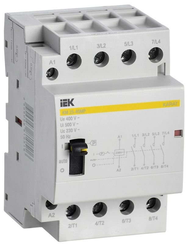 Контакторы модульные типа КМ торговой марки IEK предназначены для применения в сетях переменного тока напряжением до 400 В частоты 50 Гц и служат для коммутации слабоиндуктивных нагрузок с номинальным током до 63 А.