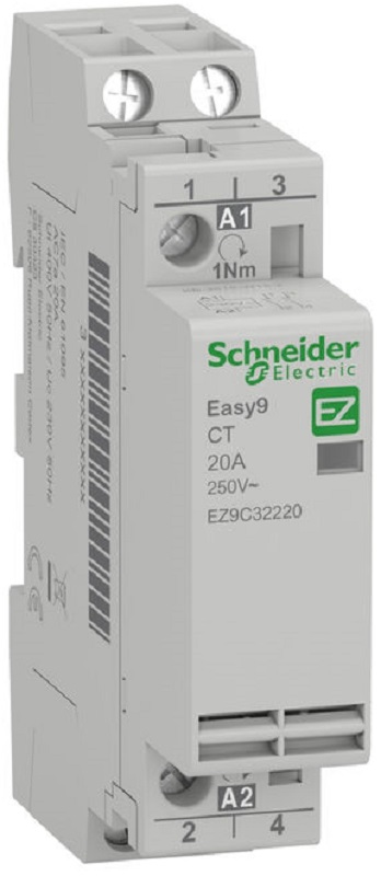 Дополнительное описание: Контактор CT серии Easy9 Schneider Electric, 2-полюсный, на номинальный ток 20 А (AC7a / AC7b), 2НО, номинальное напряжение силовой цепи - 250В, напряжение цепи управления - 230В, ширина 18 мм. - В сочетании с автоматическими выключателями или АВДТ обеспечивают дистанционное управление в однофазных и трехфазных цепях переменного тока (освещение, отопление, вентиляция, жалюзи и т.п.) - Управление неприоритетными нагрузками с помощью мастер-выключателя. - Механический индикатор положения контактов. - Крепление защёлкиванием на DIN-рейке шириной 35 мм.