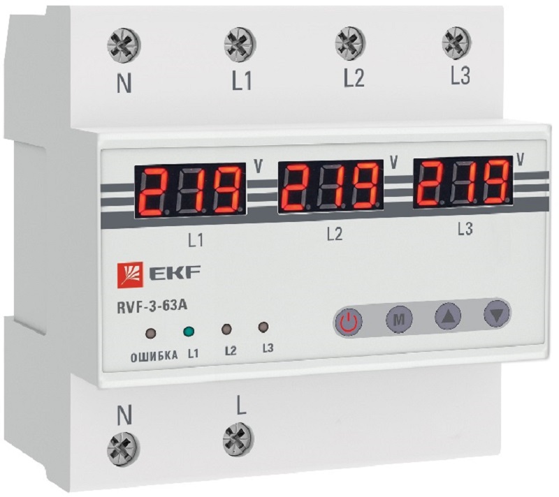 Реле выбора фаз RVF-3 EKF PROxima используется для питания однофазной нагрузки 230В/50(60) Гц от трехфазной четырехпроводной (пятипроводной) сети. Реле переключает питание однофазного потребителя в зависимости от наличия и качества фазного напряжения на проводниках L1, L2 и L3. Наиболее приоритетным является питание нагрузки от фазного проводника L1 менее приоритетным от L3, при нормальных параметрах напряжения на всех фазах, реле подключит нагрузку от приоритетной фазы (L1). Если на приоритетной фазе значение напряжения выходит за пределы порогов срабатывания, то прибор переключает нагрузку на другую фазу. Если напряжение на резервных фазах не соответствует выставленным порогам срабатывания, то нагрузка отключается