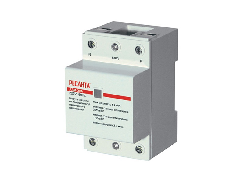 Ресанта АЗМ-40А предназначено для защитного отключения подконтрольной сети при повышении напряжения более 265 вольт или его падения ниже 170. Реле не имеет настроек, кроме заводских предустановок минимального и максимального напряжения, поэтому аппарат можно смело устанавливать в щитки на лестничных площадках и те места, где устройства защиты доступны неподготовленному персоналу.