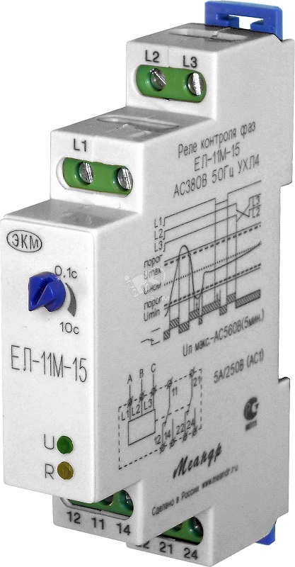 Реле контроля фаз ЕЛ-11М-15 предназначено для использования в схемах автоматического управления для контроля напряжения в трёхфазных сетях без нулевого провода, для контроля порядка чередования фаз, обрыва и «слипания» фаз, превышения (снижения) напряжения выше (ниже) фиксированного значения, а также контроля асимметрии фаз. Реле предназначено для защиты источников и преобразователей электрической энергии.