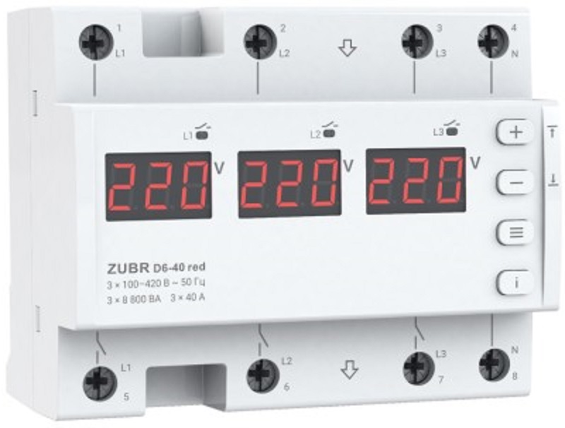 Реле напряжения D6-40 red предназначено для защиты бытового и промышленного электрооборудования (в т.ч. трехфазных электродвигателей) и может работать в режимах: однофазной или трехфазной нагрузки.