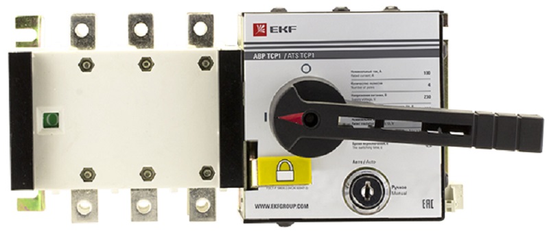 Устройство АВР ТСP1 EKF PROxima выполнено в виде моноблока и состоит из контактного блока и блока управления. На блоке управления имеется рычаг ручного переключения, замковый механизм перевода в ручной или автоматический режимы управления и запорный механизм, обеспечивающий блокировку переключения устройства АВР. Корпус контактного блока выполнен из термостойкой АВС пластмассы. Механизм переключения обеспечивает перемещение контактных групп мостикового типа, которые замыкают цепи или основной линии, или резервной линии, также предусмотрено положение, когда обе линии отключены. В металлическом корпусе блока управления смонтирован электромотор приводной механизм и реле управления. Реле управления запитано от линии L3 основного ввода. При наличии напряжения на линии L3 основного ввода реле управления подает напряжение на электромотор, который обеспечивает замыкание контактных групп основного ввода и отключается концевым выключателем после замыкания главных контактов. Попытка ручного переключения ввода приведет к включению электромотора управления, который вернет питание от основного ввода. При пропадании напряжения на основном вводе реле управления подаст напряжение от резервного ввода на электромотор управления. Работа устройства АВР от резервного ввода аналогична работе устройства АВР от основного ввода. При появлении напряжения на основном вводе устройство АВР автоматически переключится на основной ввод.