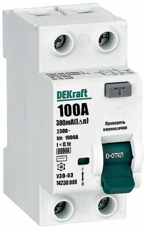 Выключатель дифференциального тока DEKraft - специализированный электромеханический аппарат без защиты от высоких токов коротких замыканий и перегрузок. Изделие обеспечивает надежную защиту человека от поражения электрическим током при контакте с токопроводящими частями, а также защиты различных силовых электроустановок от риска возгорания из-за утечек тока. УЗО предназначено для использования исключительно в сочетании с предохранителем, они устанавливаются последовательно (при этом номинальный ток УЗО должен быть на одну ступень выше).