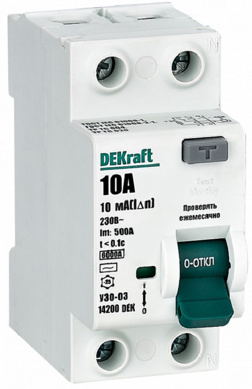 Выключатель дифференциального тока DEKraft - специализированный электромеханический аппарат без защиты от высоких токов коротких замыканий и перегрузок. Изделие обеспечивает надежную защиту человека от поражения электрическим током при контакте с токопроводящими частями, а также защиты различных силовых электроустановок от риска возгорания из-за утечек тока. УЗО предназначено для использования исключительно в сочетании с предохранителем, они устанавливаются последовательно (при этом номинальный ток УЗО должен быть на одну ступень выше).