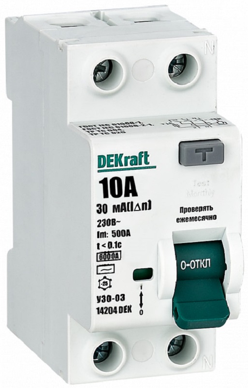 Выключатель дифференциального тока DEKraft - специализированный электромеханический аппарат без защиты от высоких токов коротких замыканий и перегрузок. Изделие обеспечивает надежную защиту человека от поражения электрическим током при контакте с токопроводящими частями, а также защиты различных силовых электроустановок от риска возгорания из-за утечек тока. УЗО предназначено для использования исключительно в сочетании с предохранителем, они устанавливаются последовательно (при этом номинальный ток УЗО должен быть на одну ступень выше).