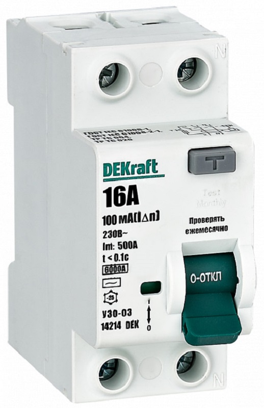 Выключатель дифференциального тока DEKraft - специализированный электромеханический аппарат без защиты от высоких токов коротких замыканий и перегрузок. Изделие обеспечивает надежную защиту человека от поражения электрическим током при контакте с токопроводящими частями, а также защиты различных силовых электроустановок от риска возгорания из-за утечек тока. УЗО предназначено для использования исключительно в сочетании с предохранителем, они устанавливаются последовательно (при этом номинальный ток УЗО должен быть на одну ступень выше).