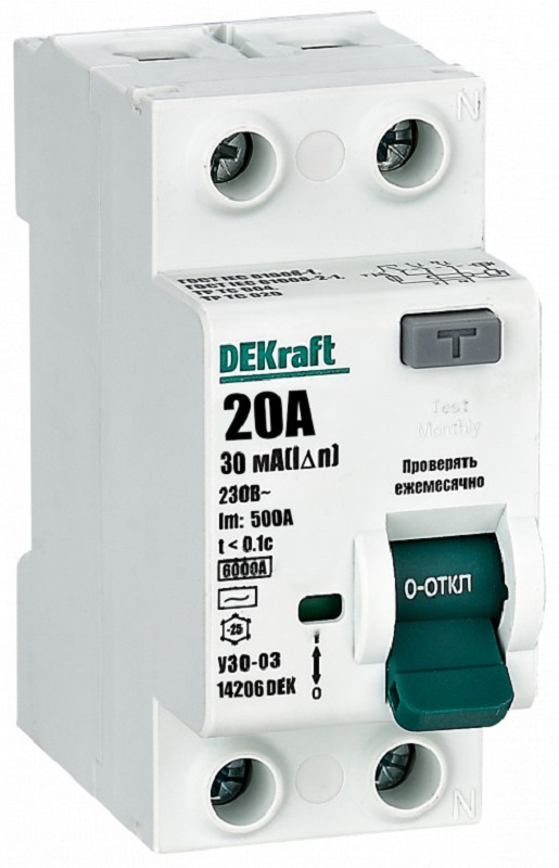 Выключатель дифференциального тока DEKraft - специализированный электромеханический аппарат без защиты от высоких токов коротких замыканий и перегрузок. Изделие обеспечивает надежную защиту человека от поражения электрическим током при контакте с токопроводящими частями, а также защиты различных силовых электроустановок от риска возгорания из-за утечек тока. УЗО предназначено для использования исключительно в сочетании с предохранителем, они устанавливаются последовательно (при этом номинальный ток УЗО должен быть на одну ступень выше).