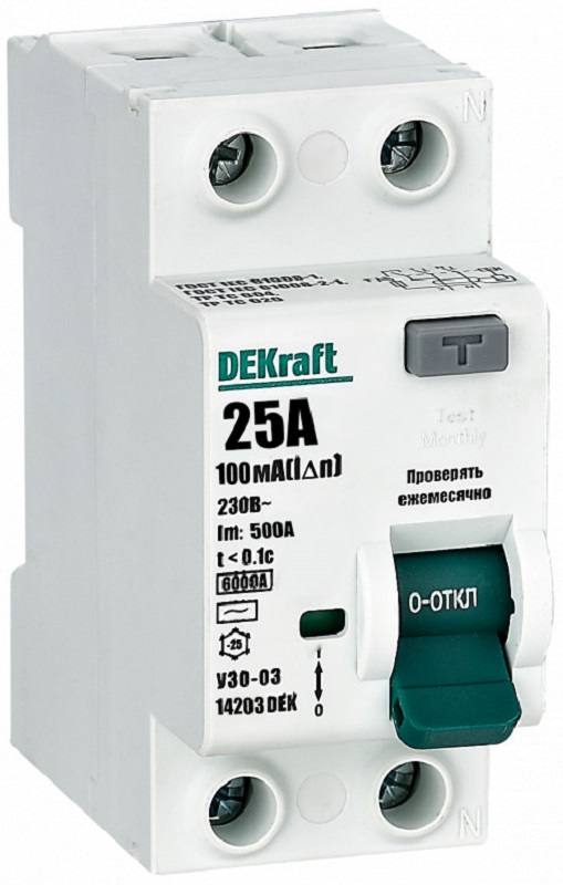 Выключатель дифференциального тока DEKraft - специализированный электромеханический аппарат без защиты от высоких токов коротких замыканий и перегрузок. Изделие обеспечивает надежную защиту человека от поражения электрическим током при контакте с токопроводящими частями, а также защиты различных силовых электроустановок от риска возгорания из-за утечек тока. УЗО предназначено для использования исключительно в сочетании с предохранителем, они устанавливаются последовательно (при этом номинальный ток УЗО должен быть на одну ступень выше).