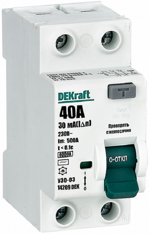 Выключатель дифференциального тока DEKraft - специализированный электромеханический аппарат без защиты от высоких токов коротких замыканий и перегрузок. Изделие обеспечивает надежную защиту человека от поражения электрическим током при контакте с токопроводящими частями, а также защиты различных силовых электроустановок от риска возгорания из-за утечек тока. УЗО предназначено для использования исключительно в сочетании с предохранителем, они устанавливаются последовательно (при этом номинальный ток УЗО должен быть на одну ступень выше).