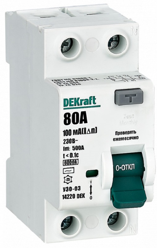 Выключатель дифференциального тока DEKraft - специализированный электромеханический аппарат без защиты от высоких токов коротких замыканий и перегрузок. Изделие обеспечивает надежную защиту человека от поражения электрическим током при контакте с токопроводящими частями, а также защиты различных силовых электроустановок от риска возгорания из-за утечек тока. УЗО предназначено для использования исключительно в сочетании с предохранителем, они устанавливаются последовательно (при этом номинальный ток УЗО должен быть на одну ступень выше).