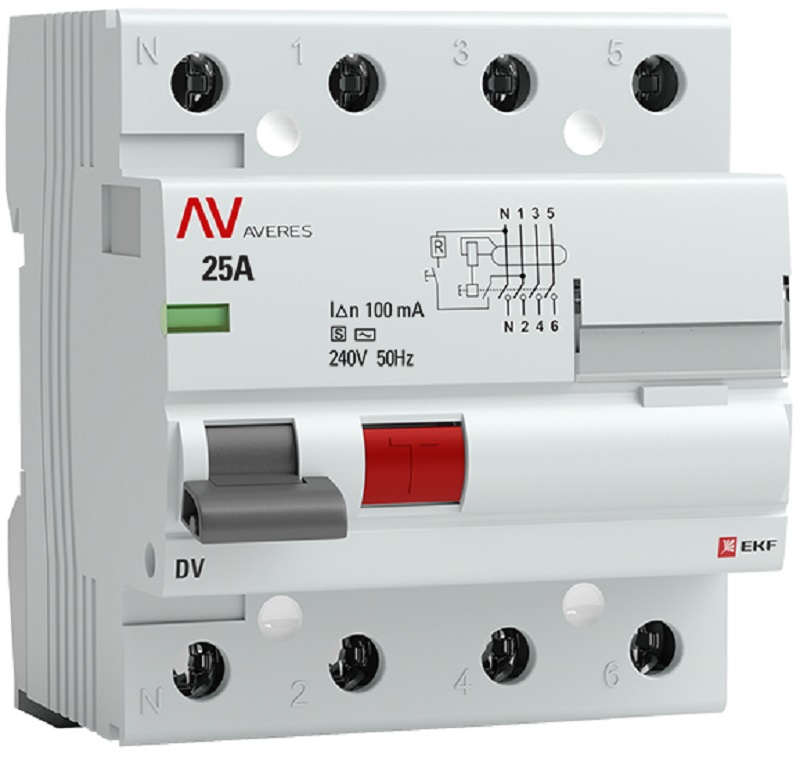 Выключатель дифференциального тока УЗО EKF Averes DV 4п 25А 100мА 10кА тип AC