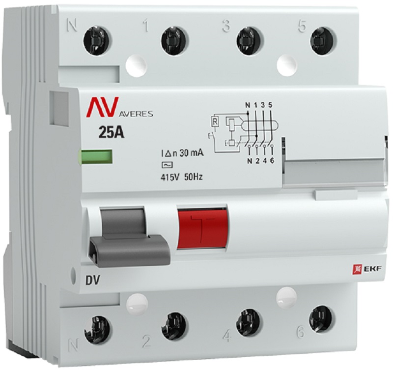 Выключатель дифференциального тока УЗО EKF Averes DV 4п 25А 30мА 10кА тип A картинка