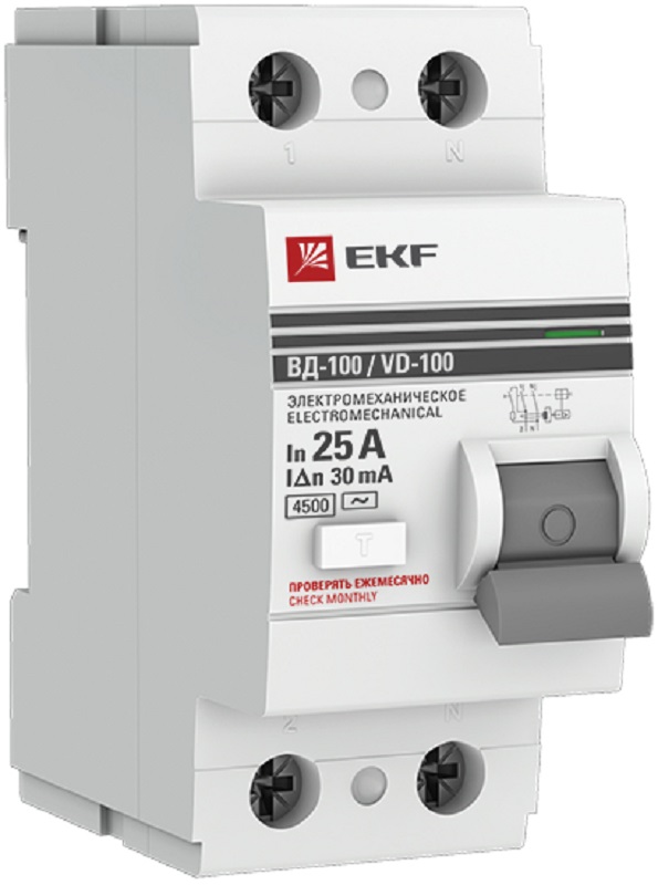 Выключатель дифференциального тока УЗО EKF PROxima ВД-100 2п 25А 30мА 4,5,кА тип AC