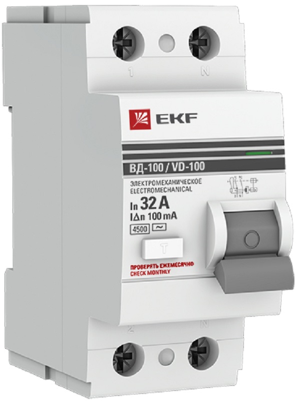 Выключатель дифференциального тока УЗО EKF PROxima ВД-100 2п 32А 100мА 4,5,кА тип AC
