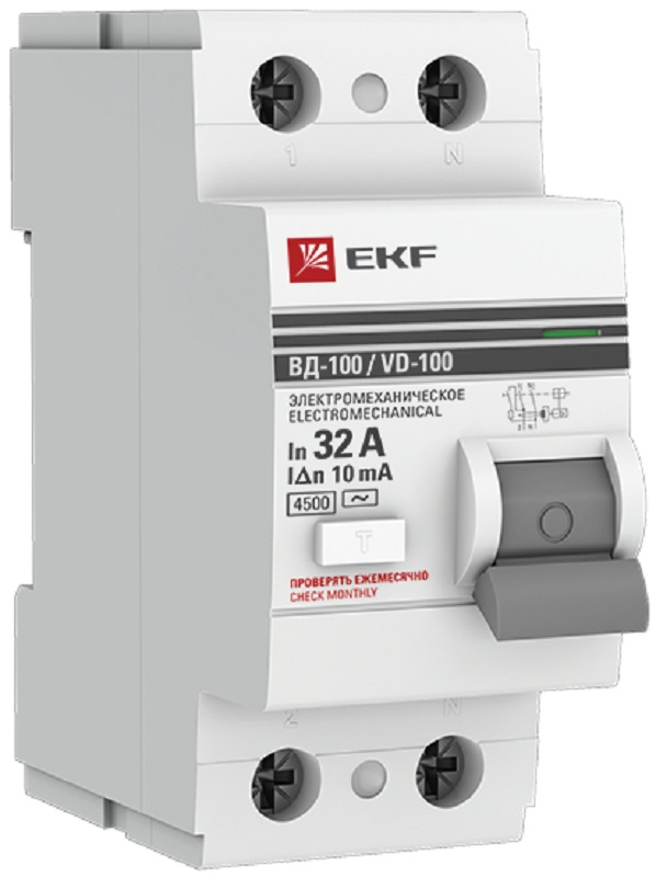 Выключатель дифференциального тока УЗО EKF PROxima ВД-100 2п 32А 10мА 4,5,кА тип AC