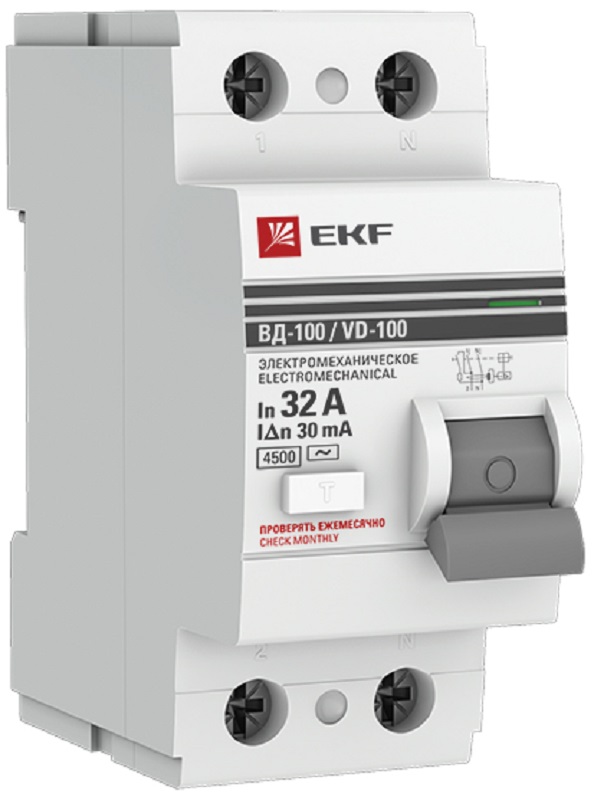 Выключатель дифференциального тока УЗО EKF PROxima ВД-100 2п 32А 30мА 4,5,кА тип AC