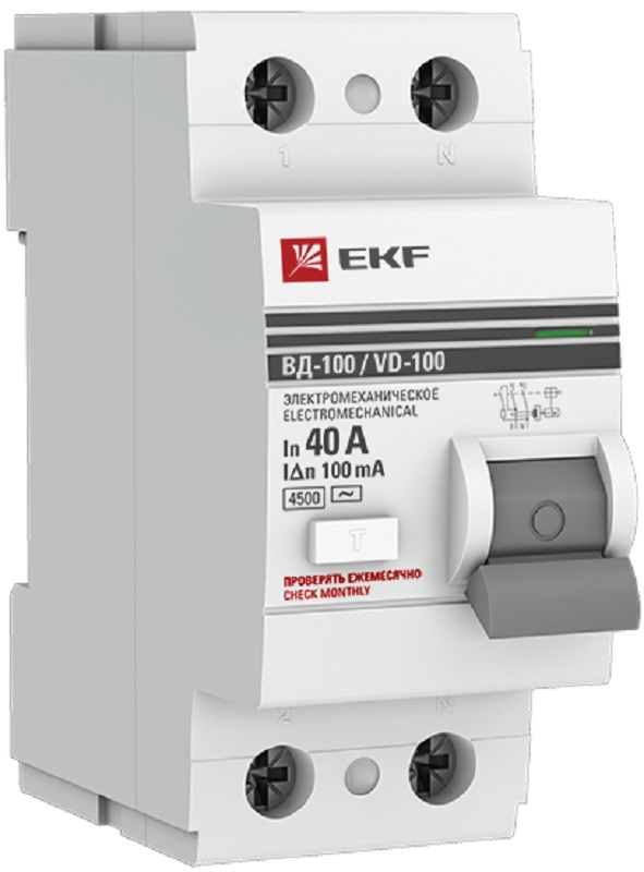 Выключатель дифференциального тока УЗО EKF PROxima ВД-100 2п 40А 100мА 4,5,кА тип AC