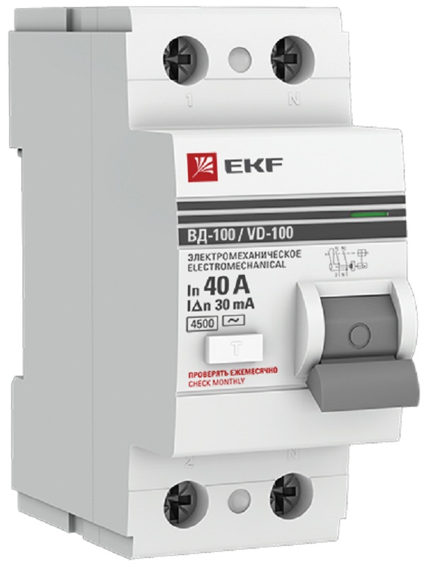 Выключатель дифференциального тока УЗО EKF PROxima ВД-100 2п 40А 30мА 4,5,кА тип AC