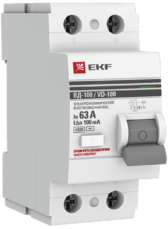 Выключатель дифференциального тока УЗО EKF PROxima ВД-100 2п 63А 100мА 4,5,кА тип AC картинка