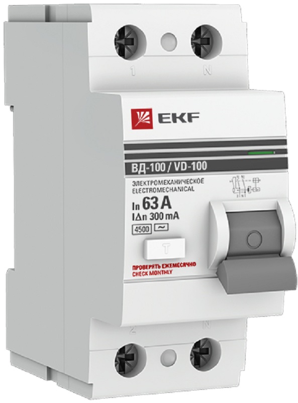 Выключатель дифференциального тока УЗО EKF PROxima ВД-100 2п 63А 300мА 4,5,кА тип AC