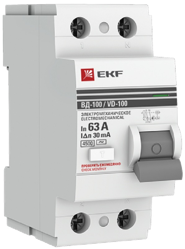 Выключатель дифференциального тока УЗО EKF PROxima ВД-100 2п 63А 30мА 4,5,кА тип AC