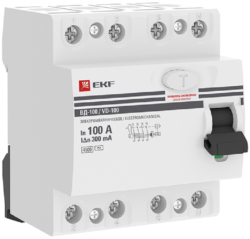 Выключатель дифференциального тока УЗО EKF PROxima ВД-100 4п 100А 300мА 4,5,кА тип AC