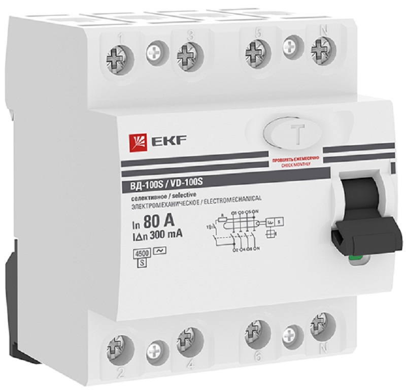 Выключатель дифференциального тока УЗО EKF PROxima ВД-100 4п 80А 300мА 4,5,кА тип AC