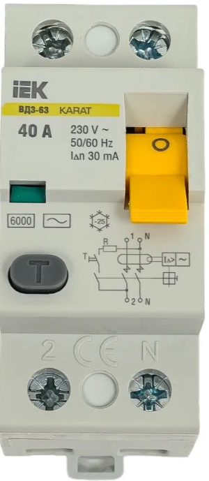 Выключатель дифференциального тока УЗО IEK KARAT ВД3-63 2п 40А 30мА 6,кА тип AC