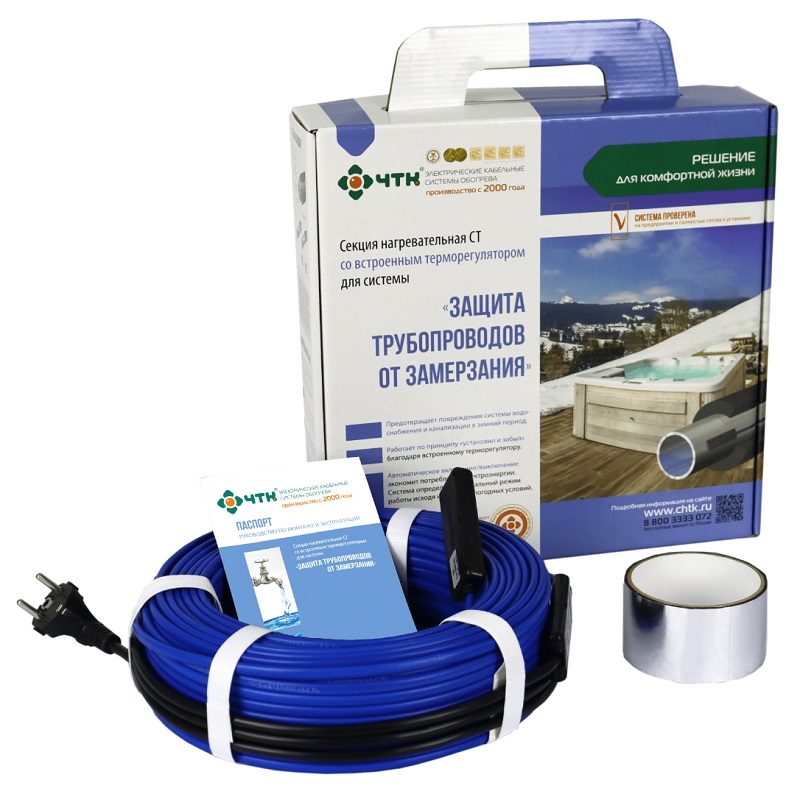 Нагревательная система ЧТК СТ-12 «Защита трубопроводов от замерзания» представляет собой эффективное средство обогрева пластиковых и металлопластиковых трубопроводов, а также клапанов, счётчиков воды, насосов водоснабжения, систем канализации и запирающих механизмов. Нагревательный кабель размерами 4,33х6,63 мм, определённой строительной длины соединён со встроенным терморегулятором с температурным диапазоном включения/ выключения (соответственно) равным +3°С / +10°С, а с другой стороны — с силовым шнуром ПВС - ВП 3х0,75 длиной 2 м.