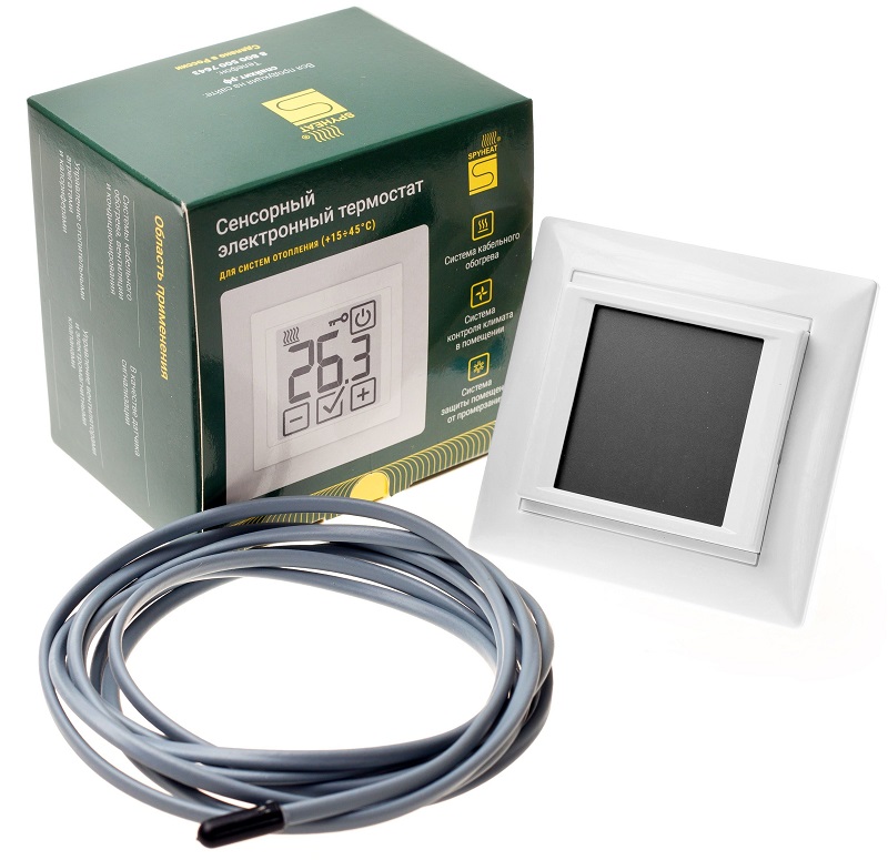 Терморегулятор с электронным управлением SpyHeat SDF-419B, белый — главным образом используется в организации теплых электрических полов. Он предназначен для автоматического поддержания заданной температуры. Информацию о температуре он получает от входящего в комплект датчика, изменяющего сопротивление в зависимости от температуры. Этот термостат подключается к сети 220В, может управлять нагрузкой до 3500 Вт (16 ампер). Форма выпуска устройства — встраиваемая (стандартная стеновая коробка 60 мм). Характеристики Коммутируемое напряжение — 240 В; Коммутируемая нагрузка/мощность — 16 А / 3500 Вт; Диапазон регулируемых температур, oC — от +15 до +45, с шагом 0.5; Напряжение питания — 220 В / 50 Гц; Управление — сенсорное; Режим работы по программе — нет; Датчик температуры — внешний (входит в комплект); Показатели датчика: сопротивление — 10кОм (при 20оС); длина — 2.5м; Корпус — встраиваемый в стеновую коробку 60 мм; Габаритные размеры (ДхШхВ), мм — 82х82х41; Степень защиты — IP67; Цвет корпуса — белый; Гарантия — 2 года; Диагональ дисплея, мм - 60.