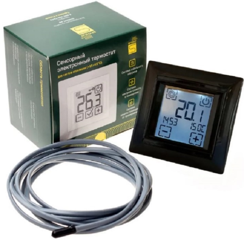 Терморегулятор с электронным управлением SpyHeat SDF-419B, черный — главным образом используется в организации теплых электрических полов. Он предназначен для автоматического поддержания заданной температуры. Информацию о температуре он получает от входящего в комплект датчика, изменяющего сопротивление в зависимости от температуры. Этот термостат подключается к сети 220В, может управлять нагрузкой до 3500 Вт (16 ампер). Форма выпуска устройства — встраиваемая (стандартная стеновая коробка 60 мм). Характеристики Коммутируемое напряжение — 240 В; Коммутируемая нагрузка/мощность — 16 А / 3500 Вт; Диапазон регулируемых температур, oC — от +15 до +45, с шагом 0.5; Напряжение питания — 220 В / 50 Гц; Управление — сенсорное; Режим работы по программе — нет; Датчик температуры — внешний (входит в комплект); Показатели датчика: сопротивление — 10кОм (при 20оС); длина — 2.5м; Корпус — встраиваемый в стеновую коробку 60 мм; Габаритные размеры (ДхШхВ), мм — 82х82х41; Степень защиты — IP67; Цвет корпуса — белый; Гарантия — 2 года; Диагональ дисплея, мм - 60.