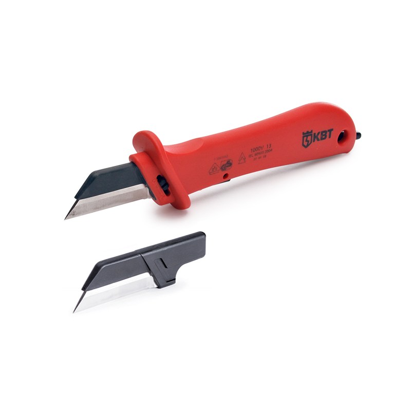 Нож изолированный со складывающимся защитным чехлом, в комплекте с ножом идет дополнительное лезвие. Применяется при зачистке жил от окисной пленки, снятии оболочки и изоляции.