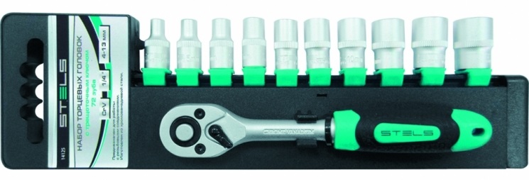 Набор торцевых головок Stels, 1/4", головки 4-13 мм, с трещоточным ключом, CrV, 11 предметов