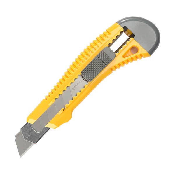 Нож имеет пластмассовый корпус с металлической направляющей, кнопку выдвижения и фиксации лезвия. Замена лезвия осуществляется вручную через хвостовую часть ножа. Предназначен для разрезания бумаги, картона и прочих материалов.