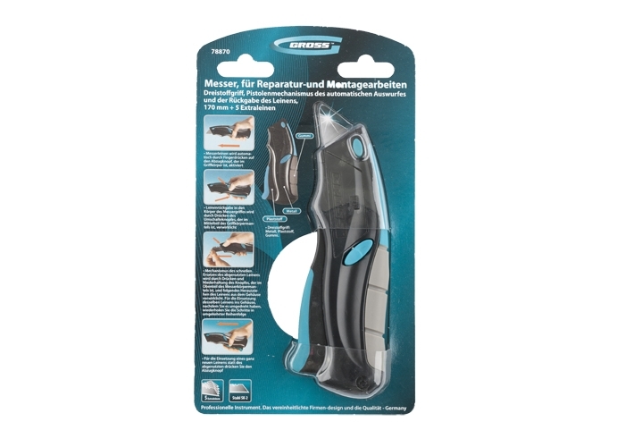 Нож технический Gross, трехкомпонентная рукоятка, авто выброс/возврат лезвия, пистолетного типа