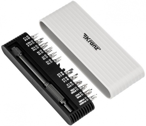 В комплекте отвертка с 24 битами: SL1 , SL1.5, SL2, SL2.5, SL3, PH0, PH1, PH00, PH000, PZ0, PZ1, PZ00, T4, T5, T6, T7, T8, T9, T10, T15, H1.5, H2.0, P2, P5