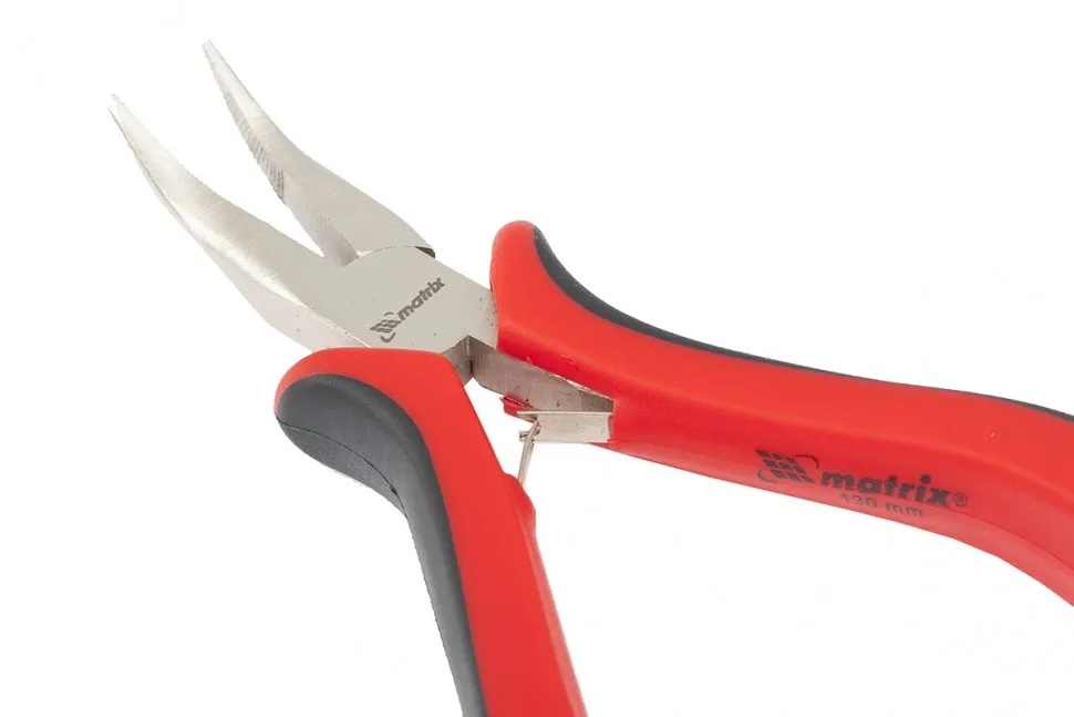 Длинногубцы мини 130 мм Matrix, никелированные, изогнутые, авторазжим, двухкомпонентные рукоятки