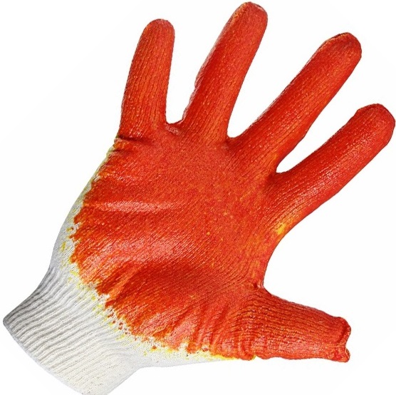 Перчатки с латексным покрытием, одинарным, ХБ, 5нитей, 40-42гр., с оверлоком. 10 класс вязки, красного цвета. Применяются при строительных и ремонтных работах, в сельском хозяйстве, на промышленных предприятиях