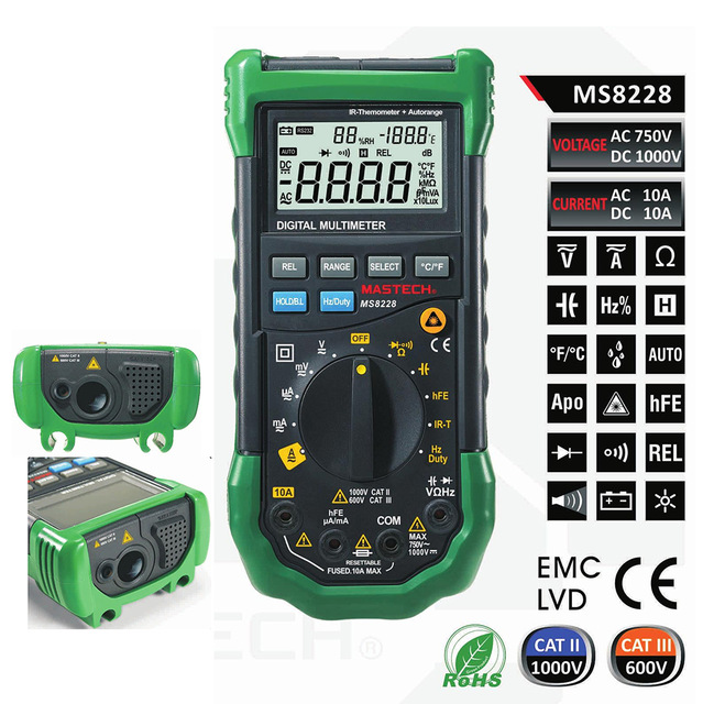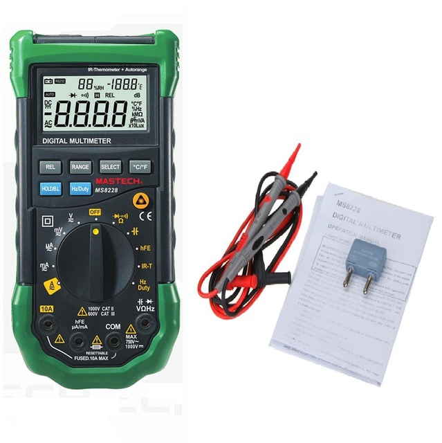 5 в 1 объединяющий в себе цифровой прибор с автоматическим выбором диапазонов измерения и звуковой сигнализацией - это цифровой мультиметр Mastech MS8228. Помимо основных функций мультиметра (измерения величин силы постоянного и переменного тока, постоянного и переменного напряжения, сопротивления), MS8228 обладает инфракрасным термометром, частотомером, измерителем скважности импульсов, измерителем ёмкости, специализированным миливольтметром и измерителем параметров транзисторов. Прибор оснащен системой световой и звуковой сигнализации в случае ошибочнго подключения измерительных щупов. Минимальное значение измеряемого тока 400 мкА, измеряемого напряжения 40мВПрибор полностью соответствует международному стандарту IEC1010-1 CATII 1000V / CATIII 600V. Mastech MS8228 имеет возможность автоматического или ручного выбора пределов измерений. Прибор обладает большим 33/4-разрядным ЖК дисплеем c подсветкой. Полученные результаты можно зафиксировать с помощью функции DATA HOLD. С помощью цифрового мультиметра MS8228 можно проверятьполупроводниковые диоды и прозванивать электрические цепи. Питание мультиметра Mastech MS8228 осуществляется от батареи 9В типа "Крона". Прибор автоматически выключится через определенное время после последних проведенных измерений.
