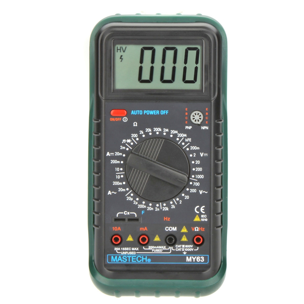Цифровой мультиметр Mastech MY63 измеряет величины силы постоянного и переменного тока, постоянного и переменного напряжения. сопротивления, коэффициента усиления биполярных транзисторов, емкость конденсаторов и частоту синусоидального сигнала в звуковом диапазоне. Высокое входное сопротивление не вносит погрешности при измерениях величин и говорит о высокой точности прибора. В приборе применен АЦП с измерением значений методом двойного интегрирования. Выбор пределов измерения величин производится вручную путем установки нужного положения многопозиционного переключателя.