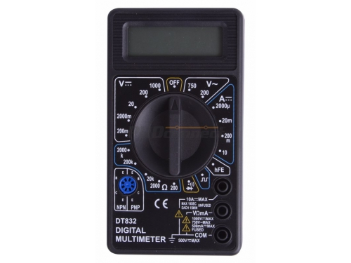 Мульти́метр —электроизмерительный прибор который включает в себя несколько функций и набор измеряемых параметров. Все приборы серии M832 измеряют постоянное и переменное напряжение, постоянный ток и сопротивление в цепи. А так же с помощью данного прибора можно проводить тестирование диодов, и осуществлять прозвонку целостности цепи. Еще одной отличительной особенностью данного прибора является функция генерирования прямоугольных сигналов (меандр), эта функция нужна для измерений и преобразований сигнала и в других областях. Прибор M832 является портативным мультиметром, компактные размеры позволяют всегда носить его с собой. Но, несмотря на малые размеры, данный мультиметр обладает широким функционалом и это выгодно отличает его от других. Инженеры старались сделать прибор максимально удобным для использования. Выбор измеряемых величин и пределов измерений производиться с помощью усиленного поворотного регулятора, благодаря которому исключается возможность случайного нажатия. Прибор изготовлен из высококачес
