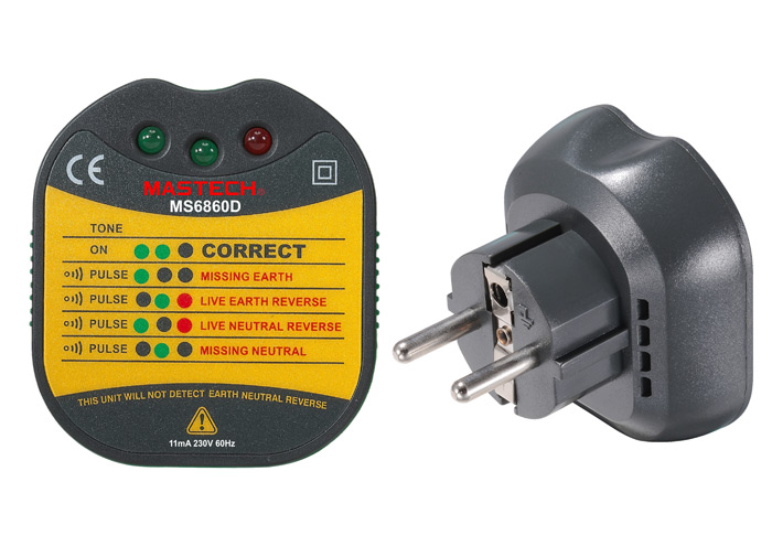 Тестер розеток Mastech MS6860D предназначен в первую очередь для контроля качества работы монтажной организации по установке евророзеток. Он оснащен световыми и звуковыми индикаторами. Тестер используется для проверки электрического питания в сетях (до 230 Вольт) и определяет различные нарушения в установленных розетках. При обнаружении неисправности тестер подает световой и звуковой сигнал.