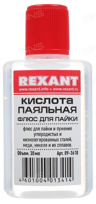 Флюс для пайки паяльная кислота 30 мл REXANT предназначен для удаления оксидов с поверхности под пайку, улучшения растекания жидкого припоя при пайке углеродистых и низколегированных сталей, меди, никеля и их сплавов. Это одно из самых распространенных средств для пайки.