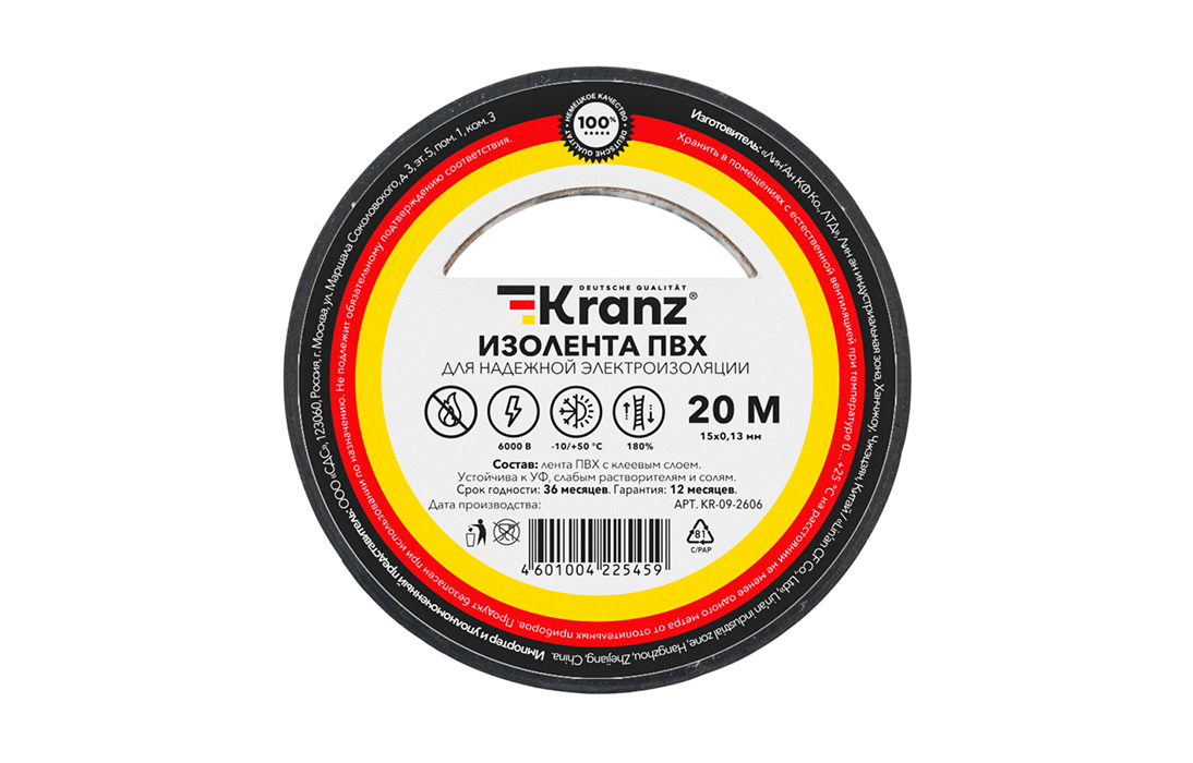 Изолента KRANZ предназначена для электрической изоляции, цветной маркировки, соединения, защиты от внешних факторов и герметизации кабелей, проводов и шнуров.